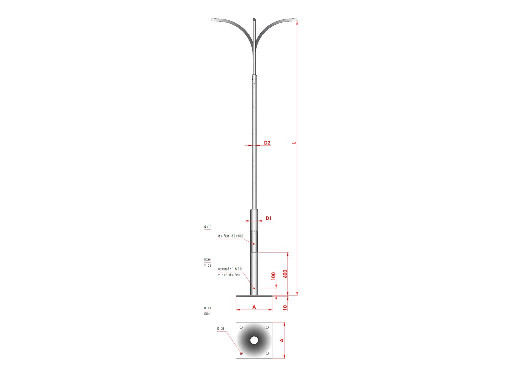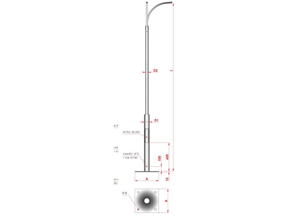 Výška L D1 D2 A Plocha stožáru Max. hmotnost svítidla